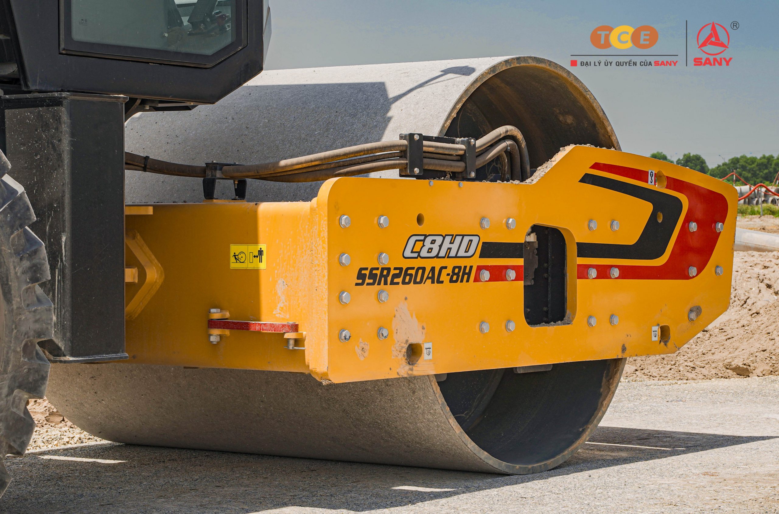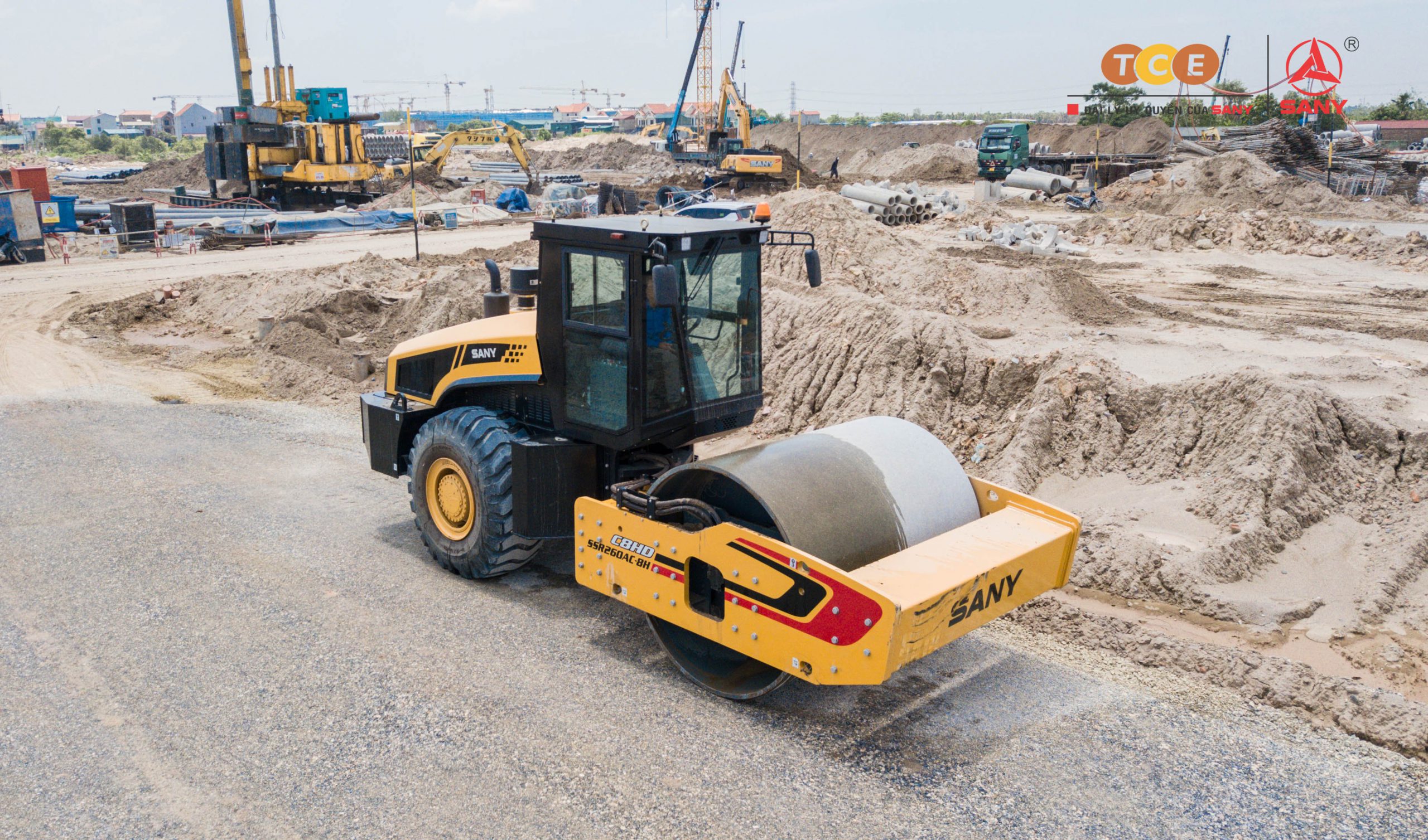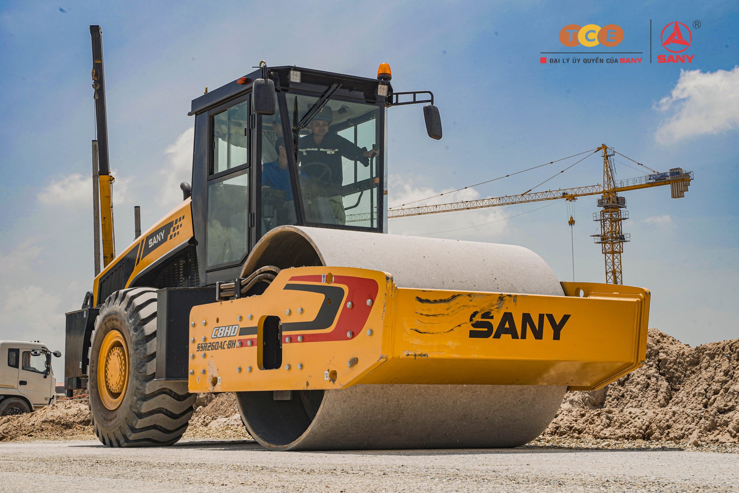 Các thiết bị SANY tham gia thi công: Xe lu 1 bánh thép SANY SSR260AC-8H, Xe trộn bê tông SANY dòng C8