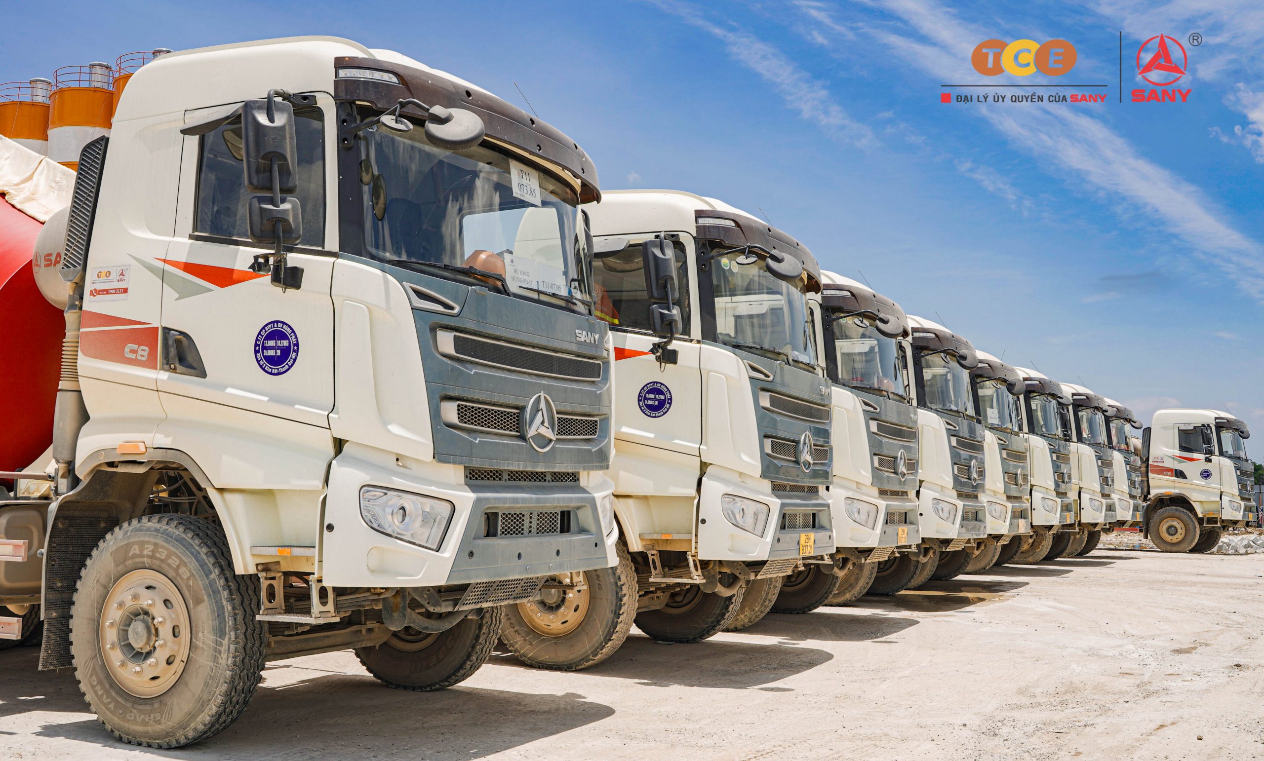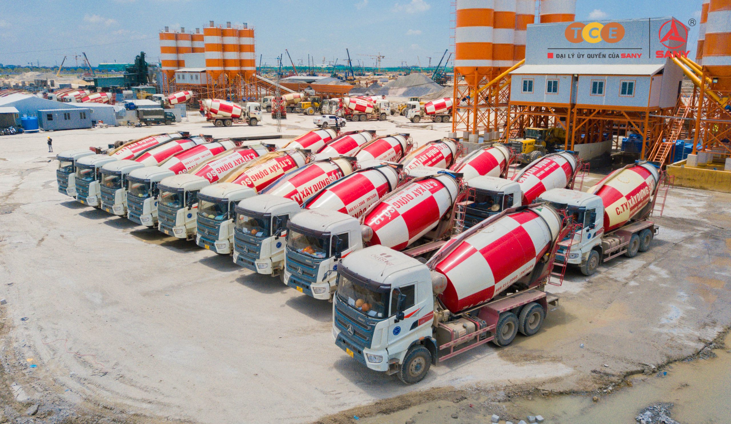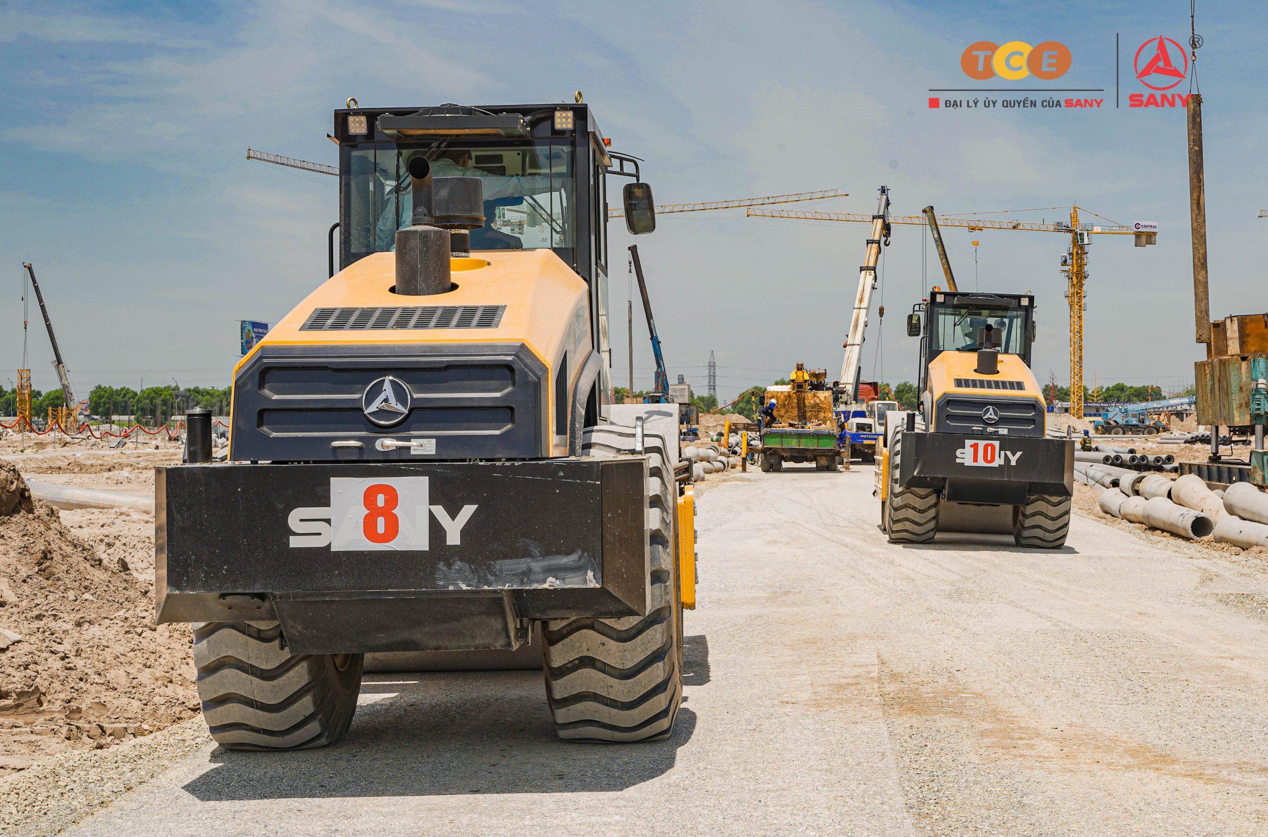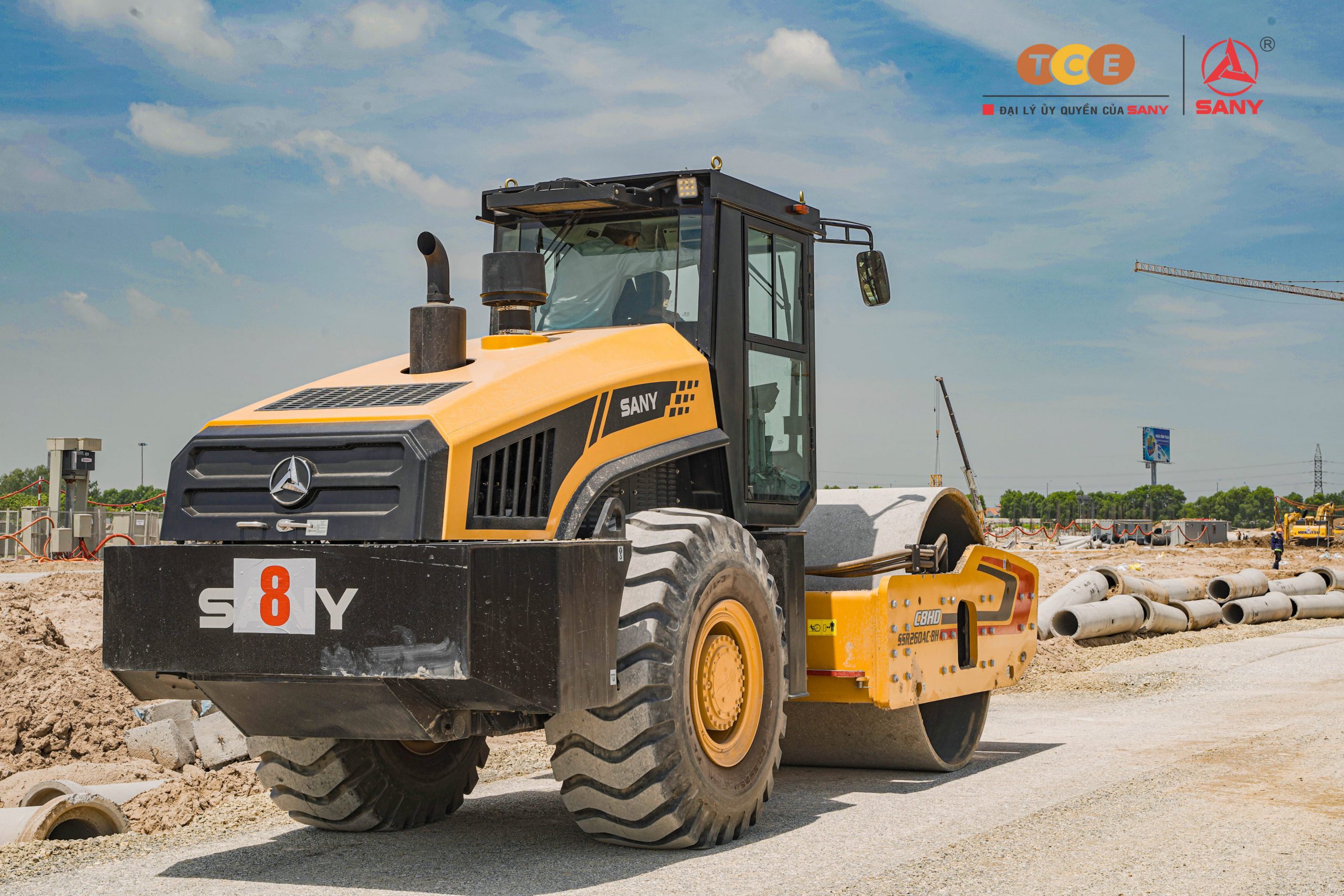 Các thiết bị SANY tham gia thi công: Xe lu 1 bánh thép SANY SSR260AC-8H, Xe trộn bê tông SANY dòng C8
